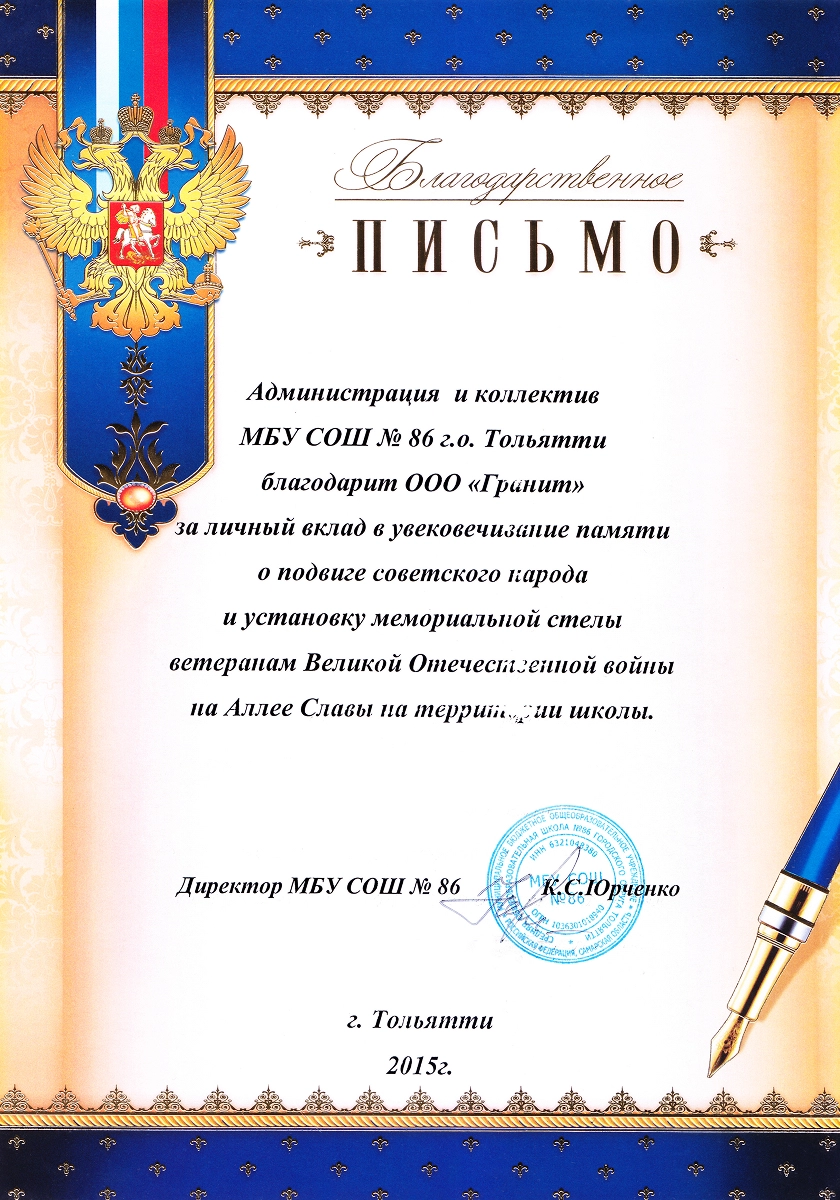 В сотрудничестве с фондом «Тольятти» установили мемориал из гранита «Аллея славы» во дворе школы № 86 на улице 40 лет Победы.